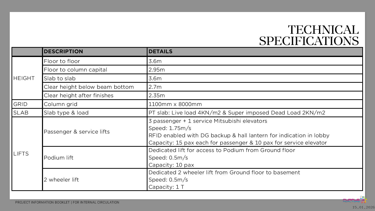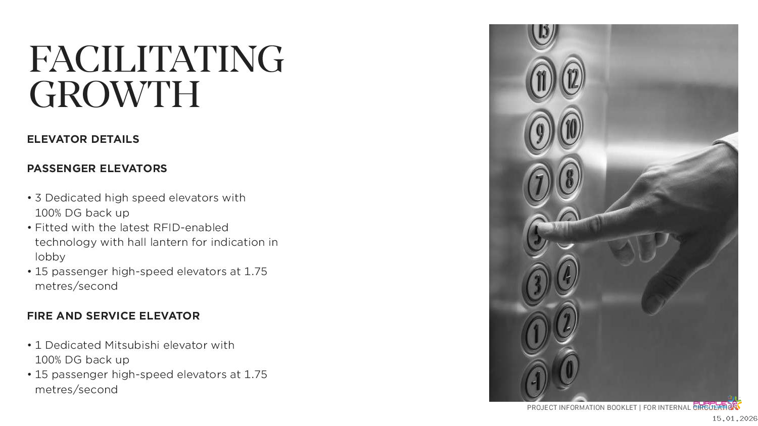 • 3 Dedicated high speed elevators with
