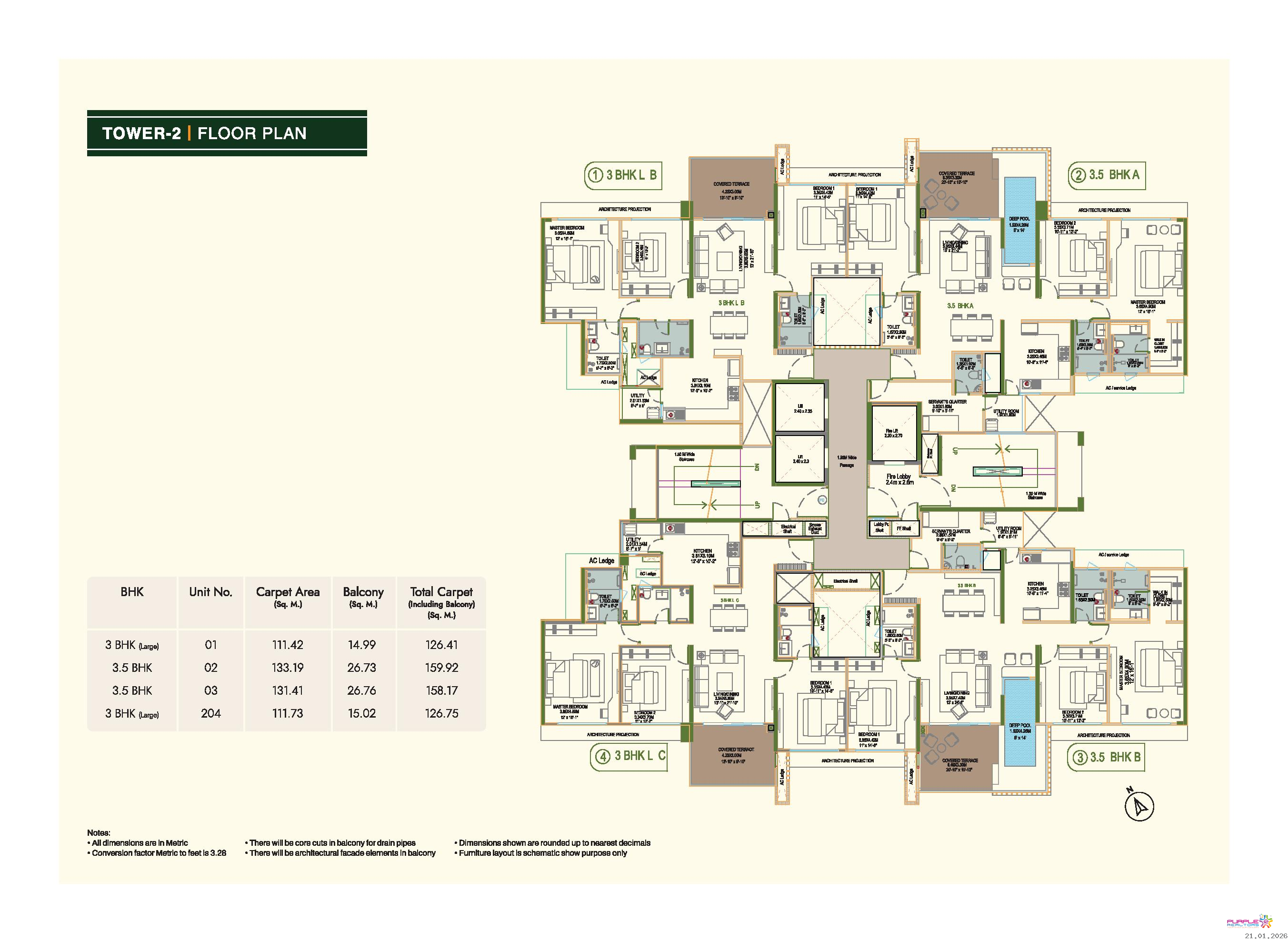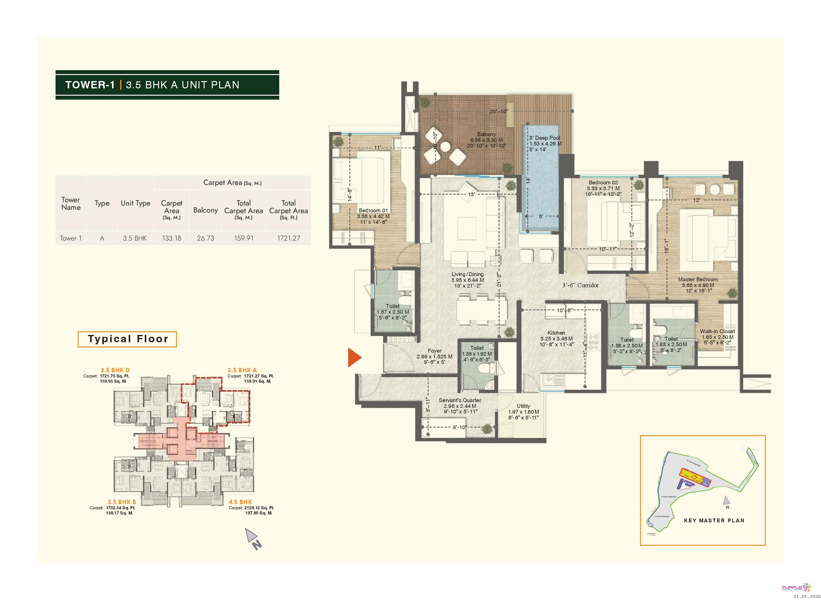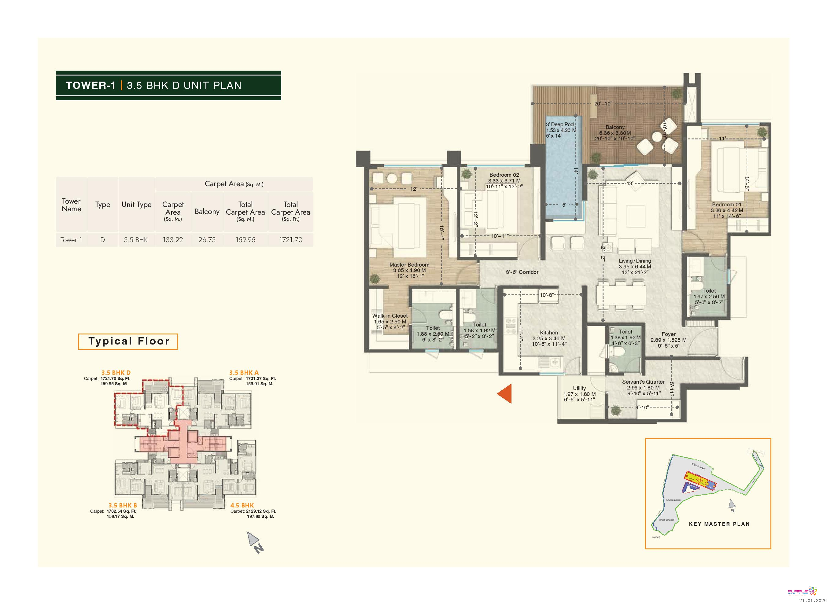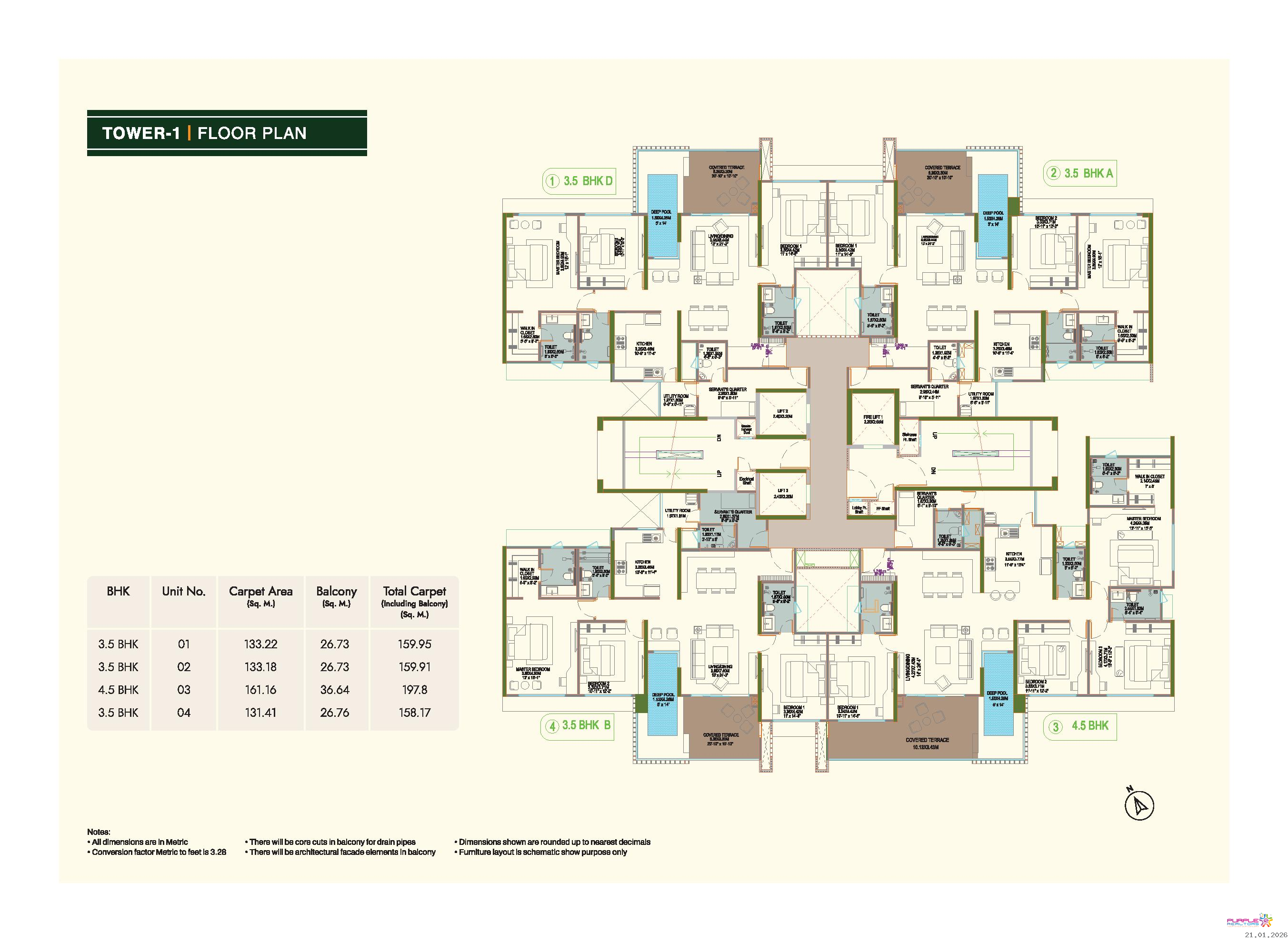 • Plunge pool for 4.5 BHK & 3.5 BHK (Type A, B, D) apartments in Tower 1