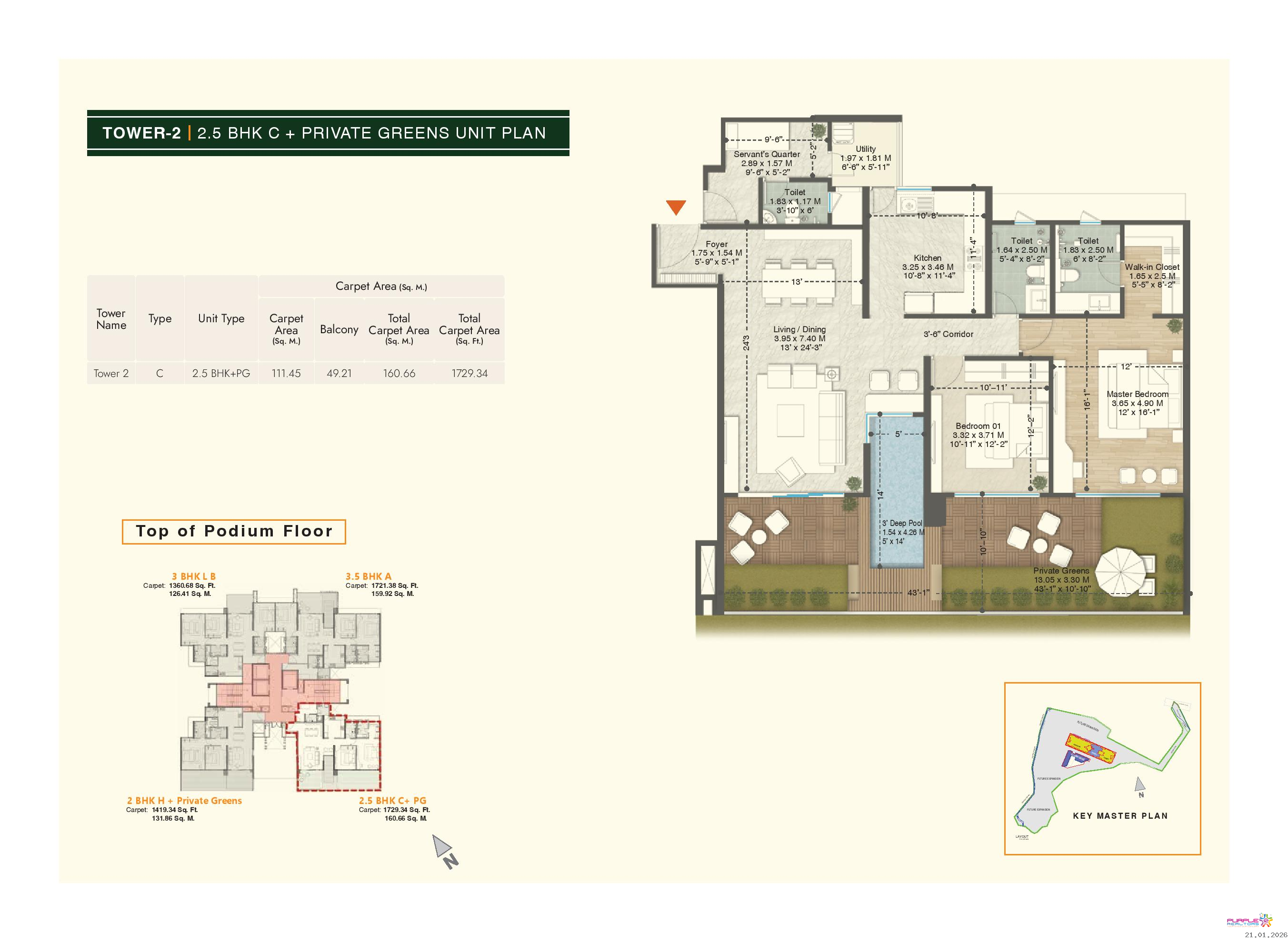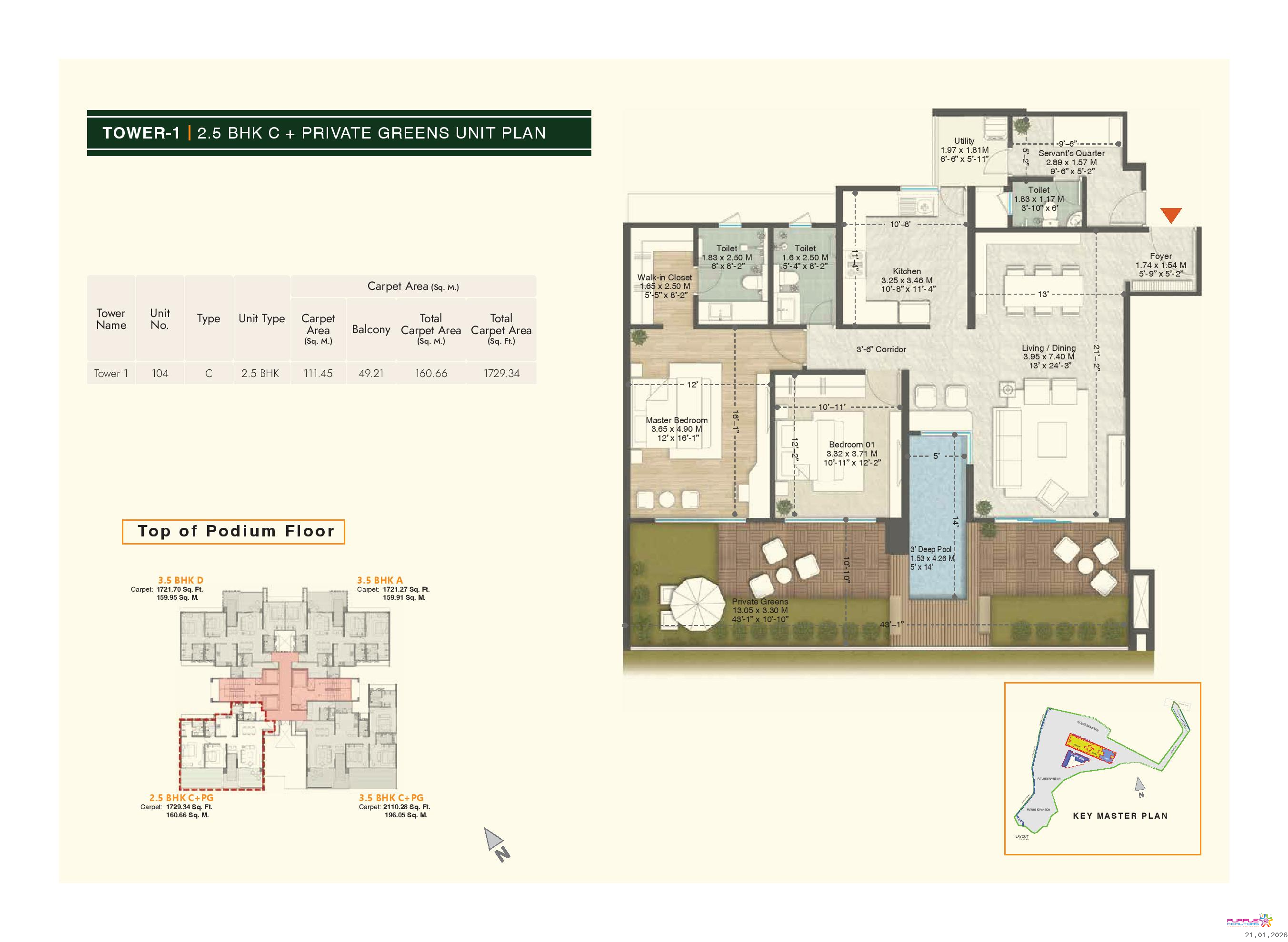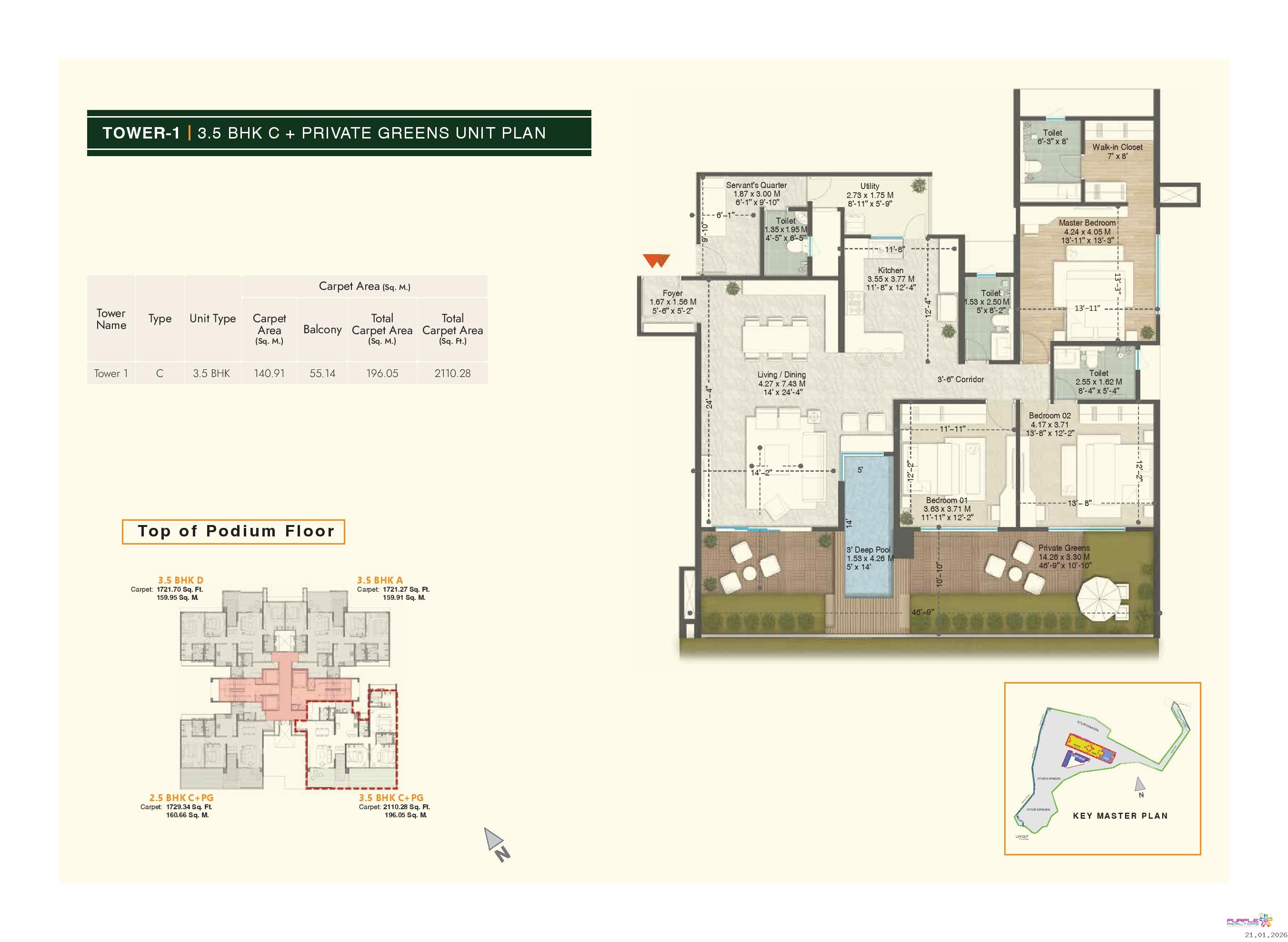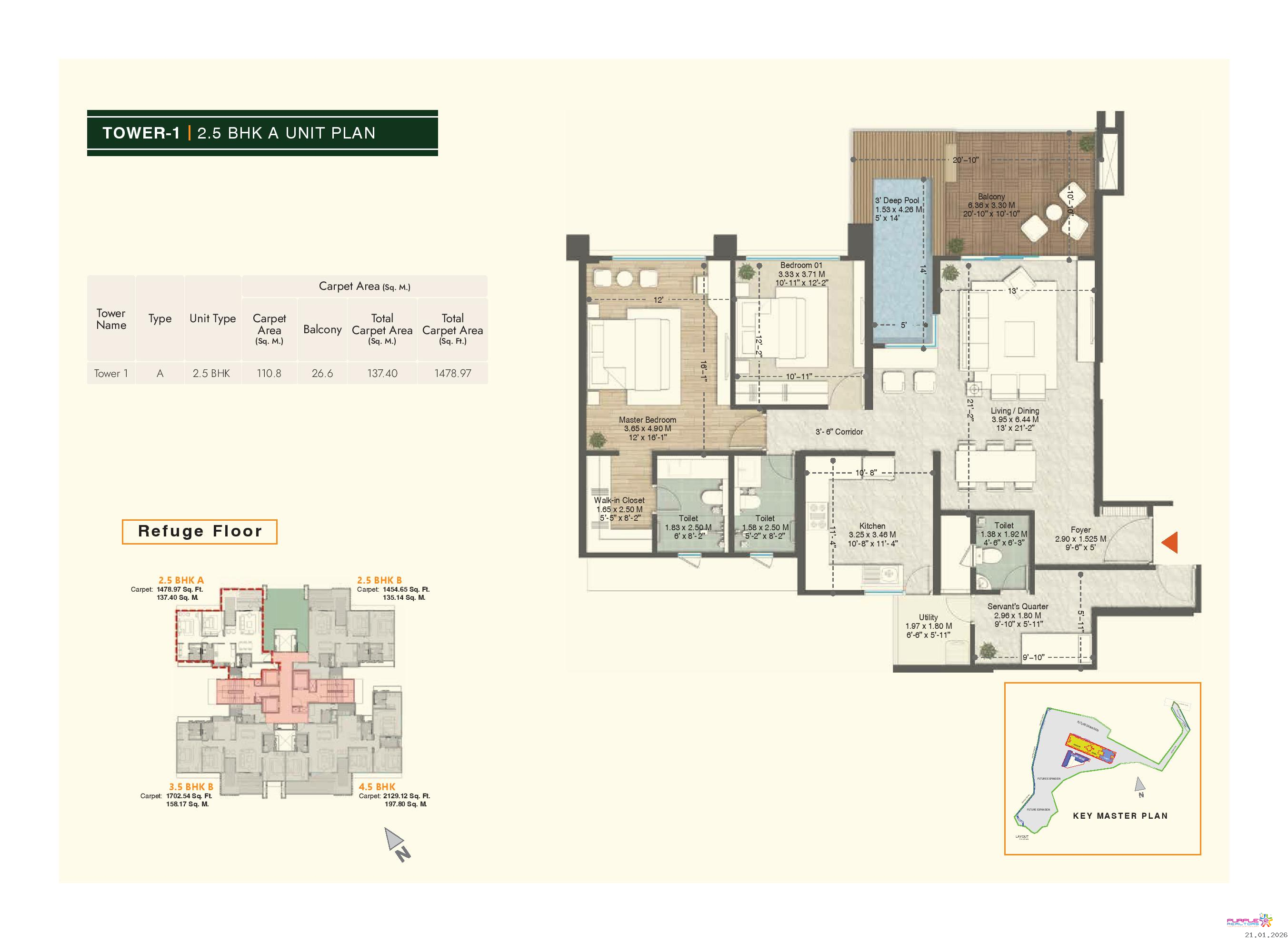 • Plunge pool for 4.5 BHK & 3.5 BHK (Type A, B, D) apartments in Tower 1