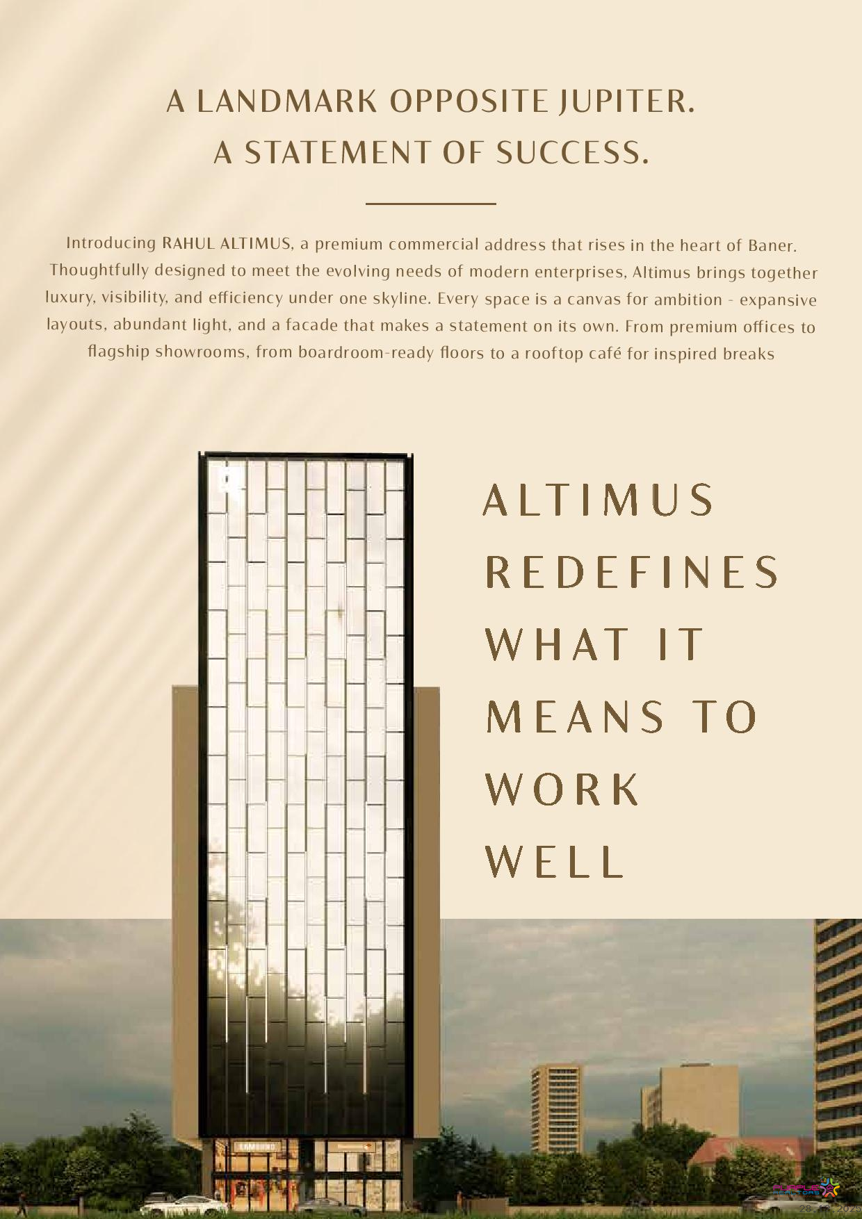 A LANDMARK OPPOSITE JUPITER. A STATEMENT OF SUCCESS. Introducing RAHUL ALTIMUS, a premium commercial address that rises in the heart of Baner. Thoughtfully designed to meet the evolving needs of modern enterprises, Altimus brings together luxury, visibility, and e?iciency under one skyline. Every space is a canvas for ambition - expansive layouts, abundant light, and a facade that makes a statement on its own. From premium offices to flagship showrooms, from boardroom-ready floors to a rooftop café for inspired breaks