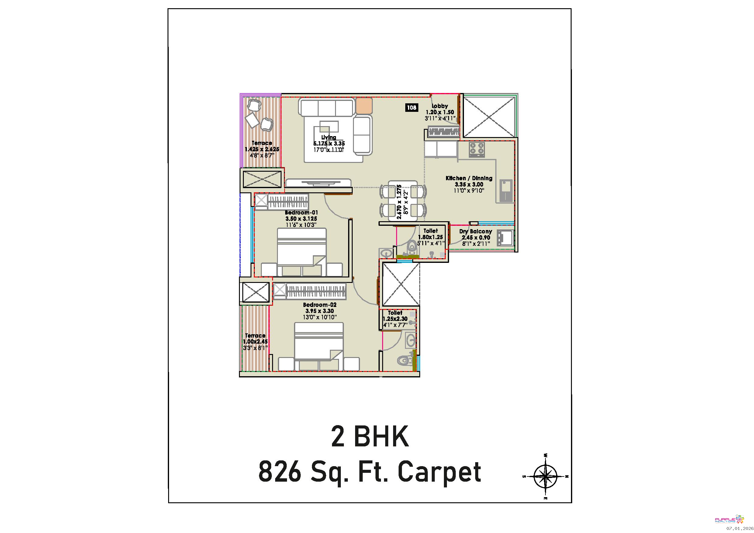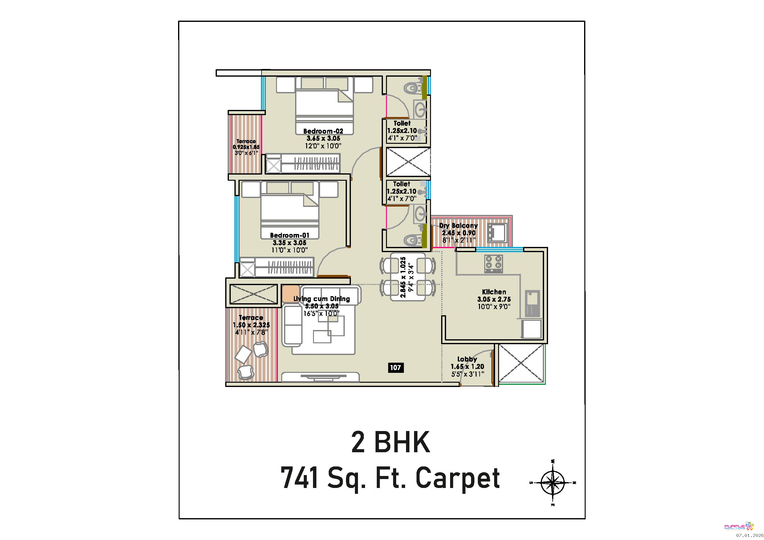 2 BHK - Carpet 741 to 826 sqft - 74.10 Lakh Onwards