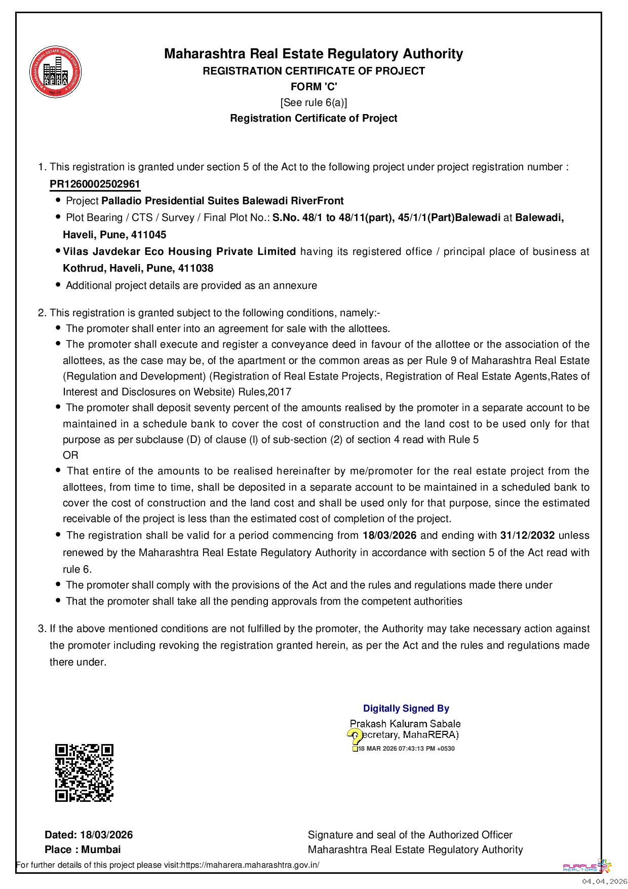 Address: VJ Palladio Presidential Suites Balewadi S.No. 48/1 to 48/11(part), 45/1/1(Part)Balewadi at Balewadi, Haveli, Pune, 411045