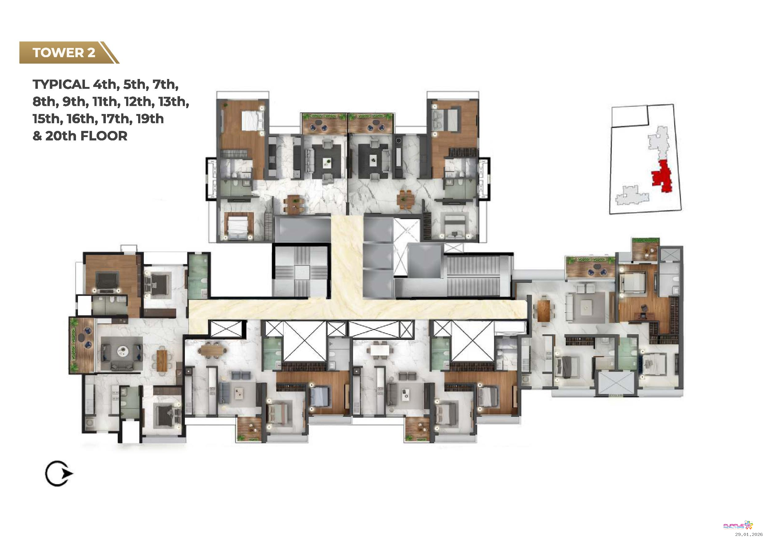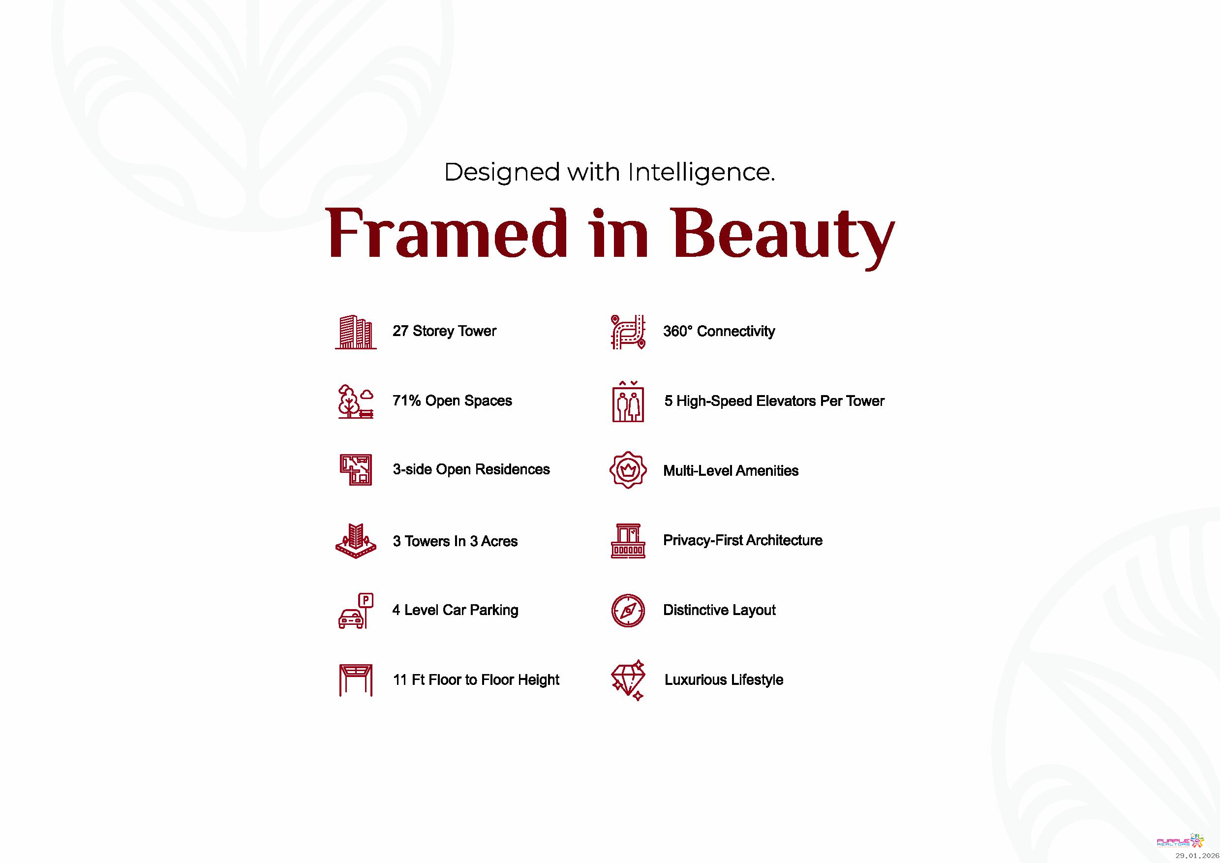 Developed by the trusted Ajwani Group, this ultra-luxury landmark proposes three iconic residential towers and one commercial tower, creating an integrated world of elegance and convenience. The project offers 2 & 3 BHK PREMIUM HOMES, designed for those who seek timeless sophistication and thoughtful living.